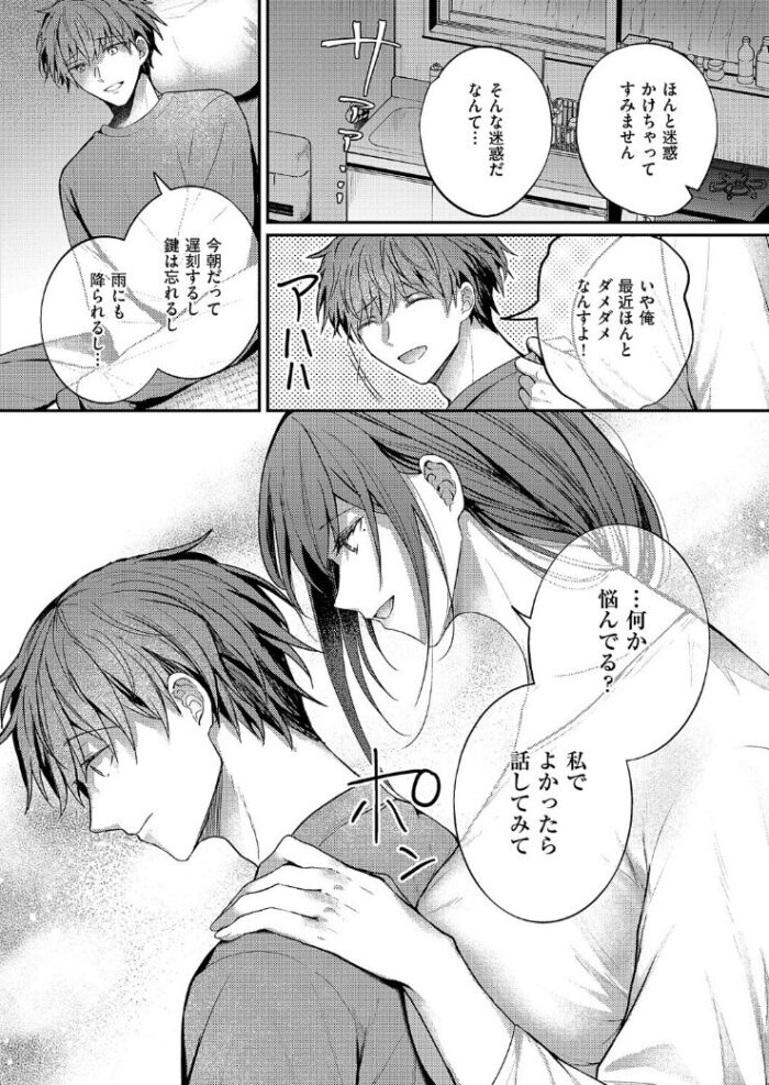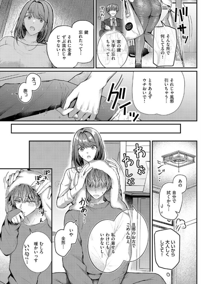 ある日、雨が降ったにも関わらず将汰が鍵を忘れてドアの前でずぶ濡れになって座っていたところ、馨さんが帰って来てその姿を見つけると強引に腕を引いて部屋に招いき、旦那のお古という服に将汰を着替えさせ、タオルで濡れた頭を拭いてくれるなど母性本能に甘えたくなってしまうのは当然です。