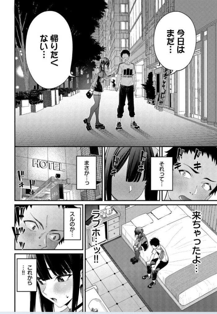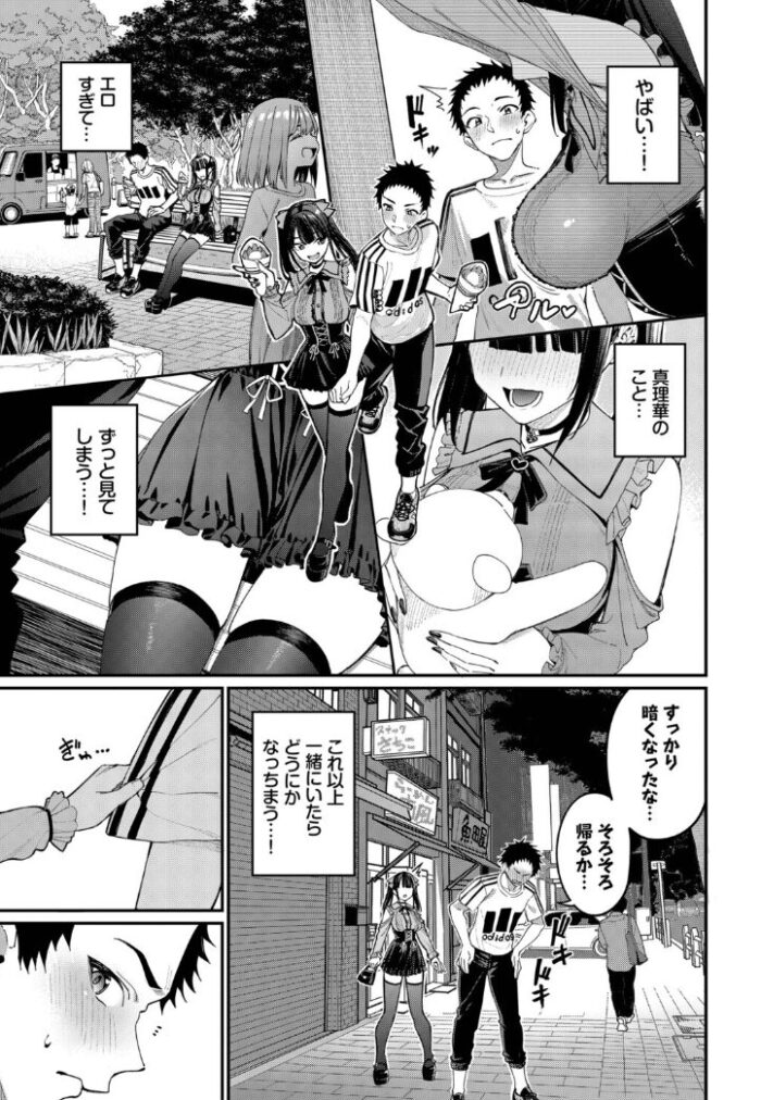 夜も遅くなり健人が帰ろうとしたところ、真理華の方からまだ帰りたくないと言ったのは大胆だと思いました。普段は地味な真理華とのギャップが魅力的で、一歩進んだ二人の関係が羨ましかったです。真理華の大胆なところも見どころです。地雷系の服装のままセックスしちゃうのも個人的には盛り上がりました。