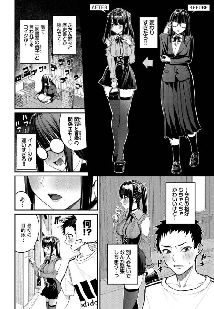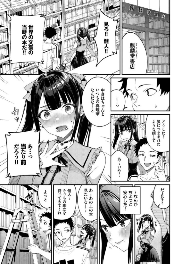 デートに現れた真理華は普段の歴史好きで地味な様子とは打って変わって、いわゆる地雷系というスタイルに変貌し、さらに胸や脚を強調する服装でかわいらしさが増していました。デートの行先は書店で、貴重な歴史書に真理華が目を輝かせて夢中になっている一方で、高い位置の本を手に取るなどの動きの中に見える胸や脚が気になる健人の気持ちは良く分かりました。