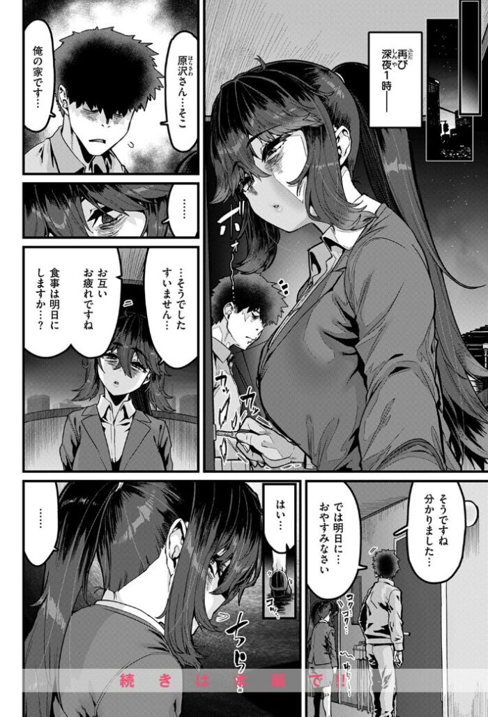 ヒロイン・原沢の疲れ具合が出たキャラデザも秀逸だと思いました。初めは独特なタッチの絵だなと思いましたが、読み進むに連れて2人には幸せになってほしいという感情が湧いていました。「ある日、勢いで暴走!」という感じで、勢いよく中出し2連発を決めるのだがこれまた精子量がえらく多いのには驚きです。