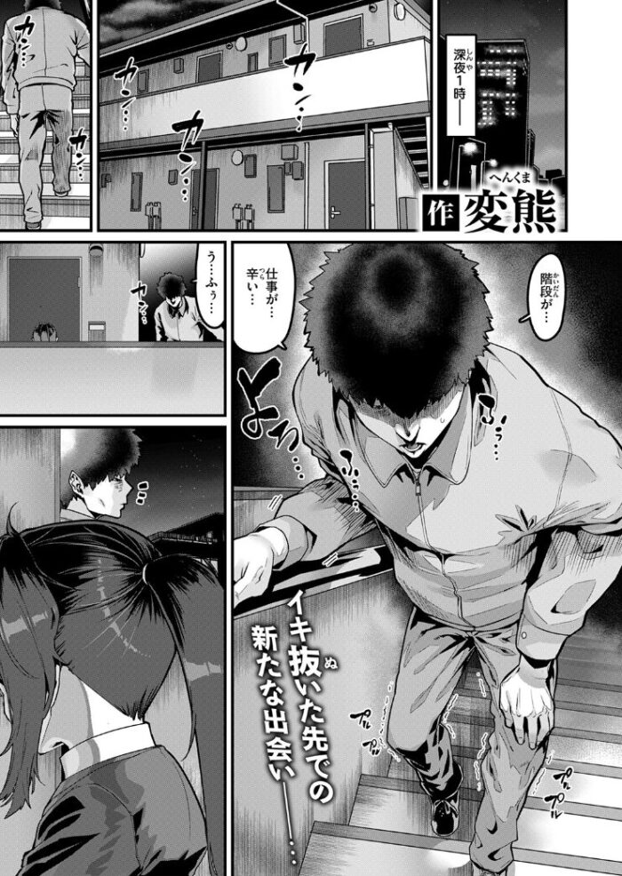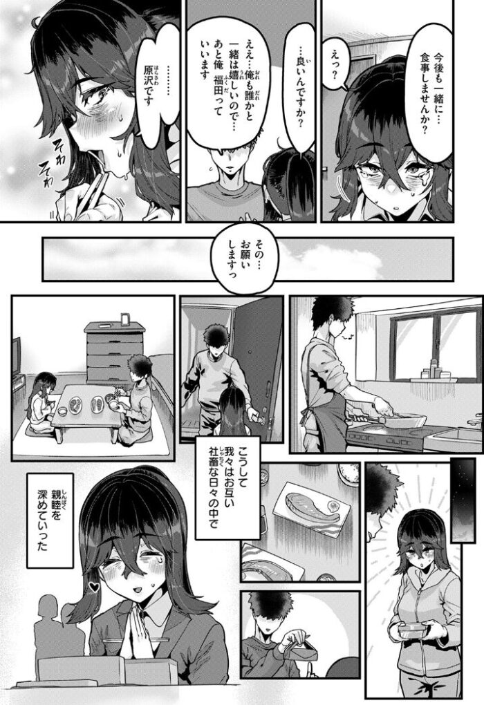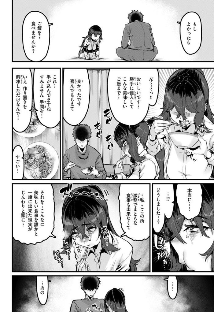 ・ゾンビのごとく疲れ切った社畜2人が、たまたま部屋を間違えたことから仲良くなってやがてご飯を共にする関係になっていきます。 ガチで2人とも目の下にはがっつりクマができていて、足元もふらふらするほどの疲れよう。 こんなありさまでエッチできるんかいなと思いましたが、しっかりとその程度の余力は残っていたようでそちらの方でも楽しめました。