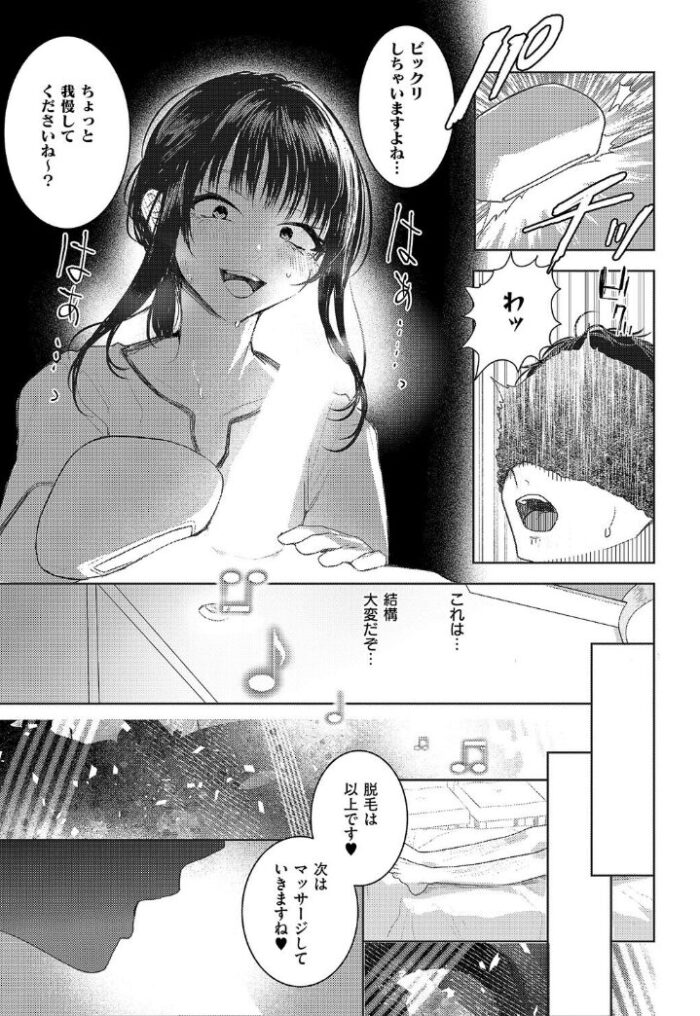 ・脱毛の施術をしてくれるお姉さんが主人公にどんどん誘惑を仕掛けていく様子にドキドキが止まらなくなる作品でした。 二人っきりの個室だからこそいけないことができるけれど、あまり大きい声を出せば周りにバレてしまう絶妙なシチュエーションも、この作品の面白さを高めていると思いました。